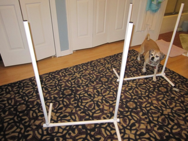 Zora and I worked on weave poles again today. She’s getting better. This session might have gone better if I had focused more on her and less on the camera, but you can see the set-up. We’re working in my bedroom, since that’s the largest open space I have. We were able to progress to having them less angled.