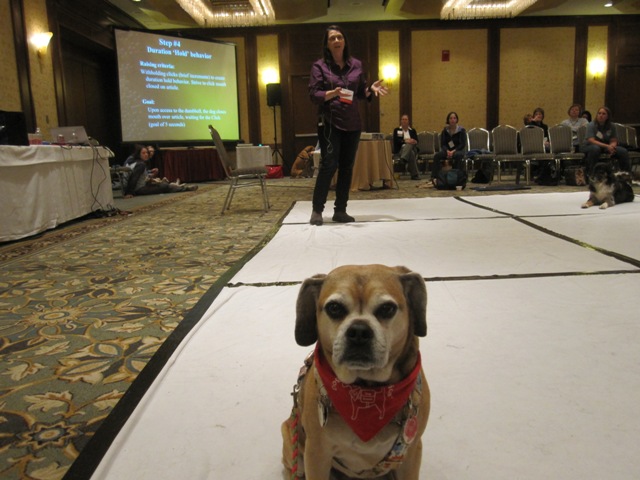 The last lab that Zora and I attended was ‘Hold It, Get It, Bring It’ with Michele Pouliot. The goal of this lab was to learn the duration hold portion of the retrieve. This is the part that I have been having difficulty teaching Zora. We re-taught the entire thing from the beginning, the RIGHT way! I loved all the amazing feedback from the audience and from Michelle. Step 1 was to ‘love the article’, so we went back to nose touches with really yummy treats.