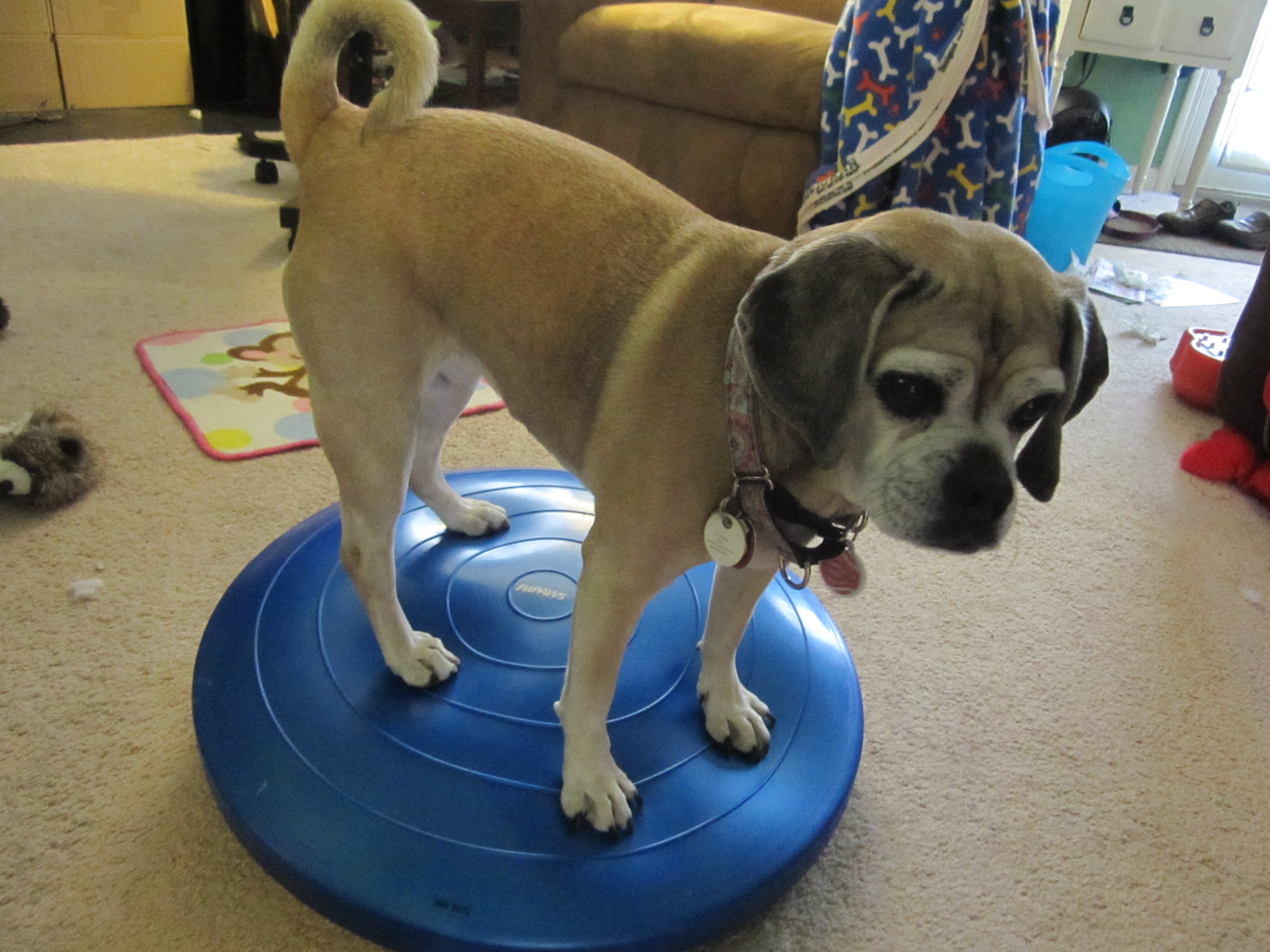 Zora really likes the balance disc that we got last month. She asks to play with it by hitting it with her paw. I keep it leaning against the wall when we’re not using it. I don’t want her on it without supervison so she doesn’t hurt herself.