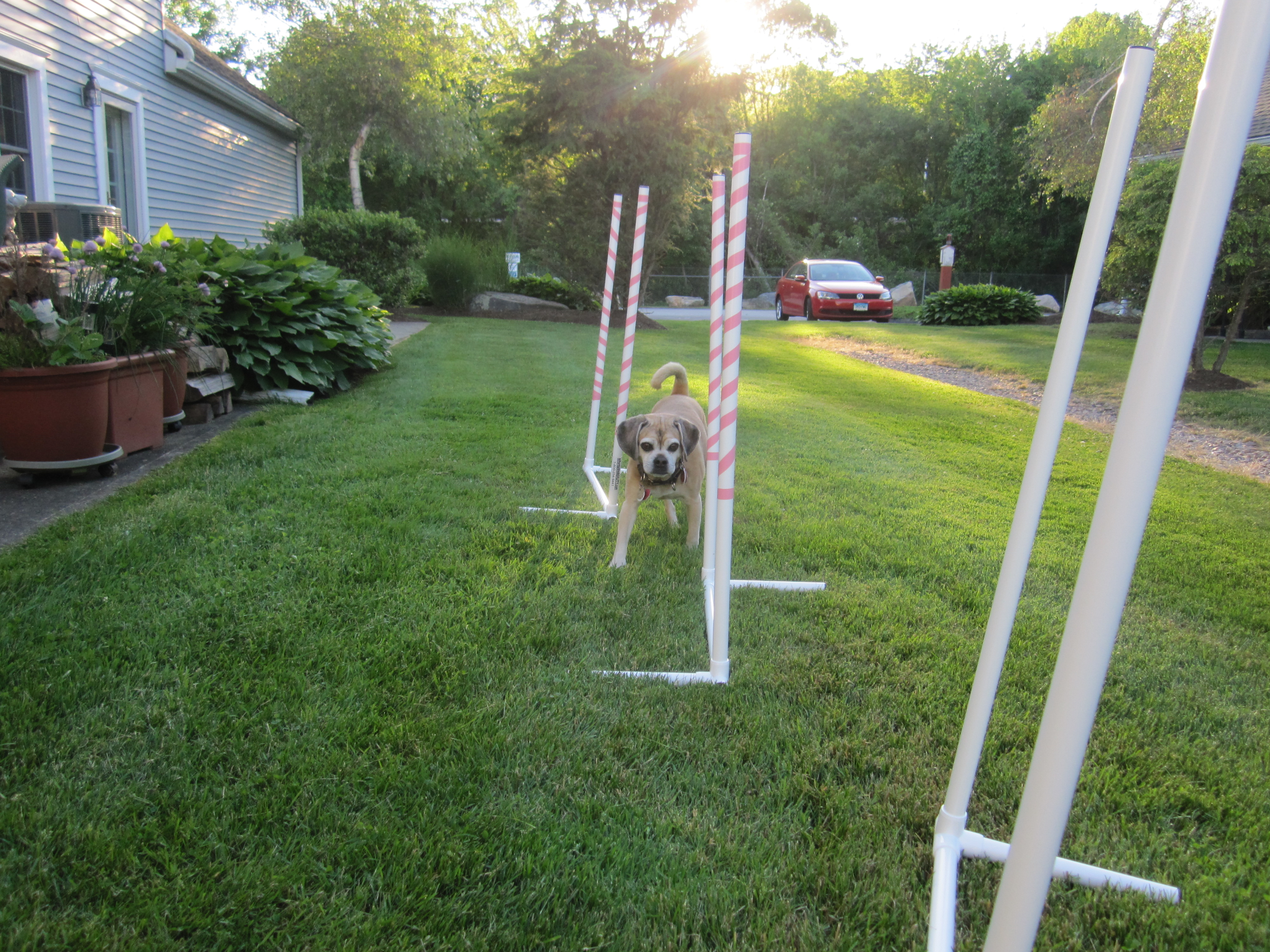 Now that the weather is warm, I’ve been bringing her 2×2 weave poles outside to practice with. She’s getting really good at this and is making very few mistakes. She can do all 6 poles now and they are almost straight. She did all 6 at agility class last night!